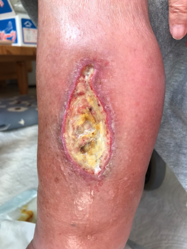 私の左脹脛の皮膚がベッドの金具に押し当てらたまま