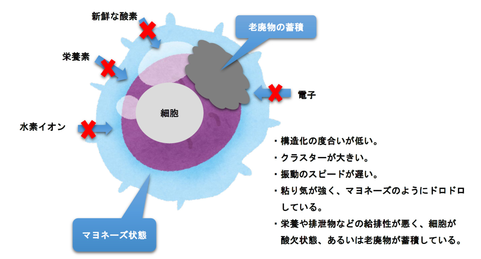 ⇒ 栄養と排泄物の通路である「水」が不活性になると、細胞は弱っていく