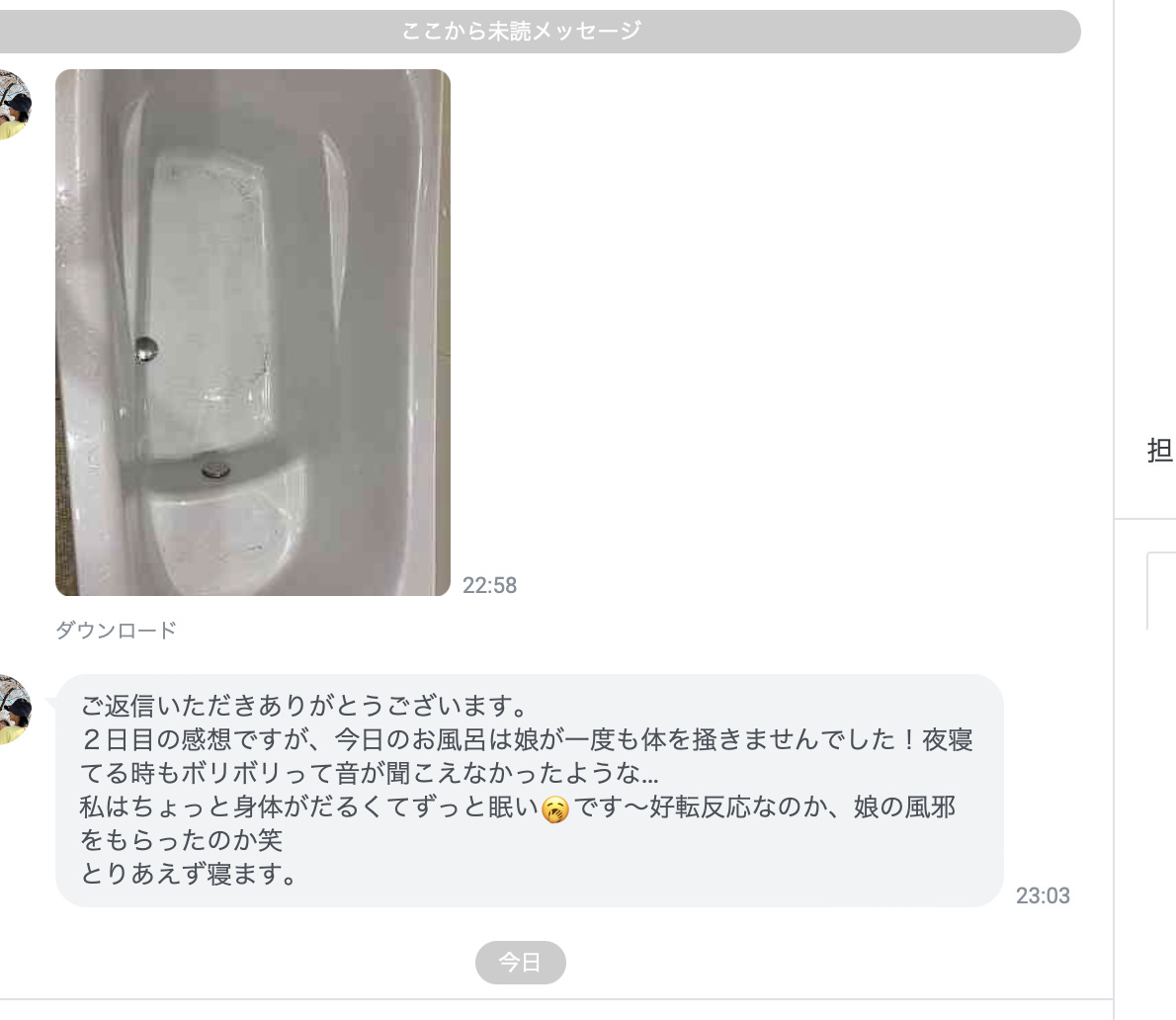 2日目の感想ですが、今日のお風呂は娘が一度も体を掻きませんでした!夜寝てる時もボリボリって音が聞こえなかったような…