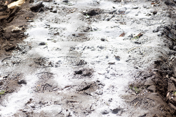 前述したような土壌条件を変えるため(土壌内に残留する硫酸を中和する方法として)石灰を投入していきます。しかし石灰はセメントの材料であり、酸性に傾いた土壌を中性にすることには役立ちますが、土を固くしてしまいます。