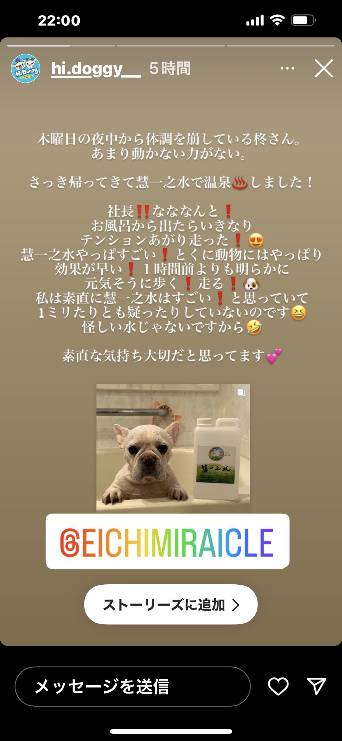 愛知県のKさんからこの慧一之水使ってみて!ってやり方を教えてもらって3回分をいただきました。 いただいた時は、笑いながら何?何?この怪しい水💦って喋ってました。 早速、私は、その日から使って […]